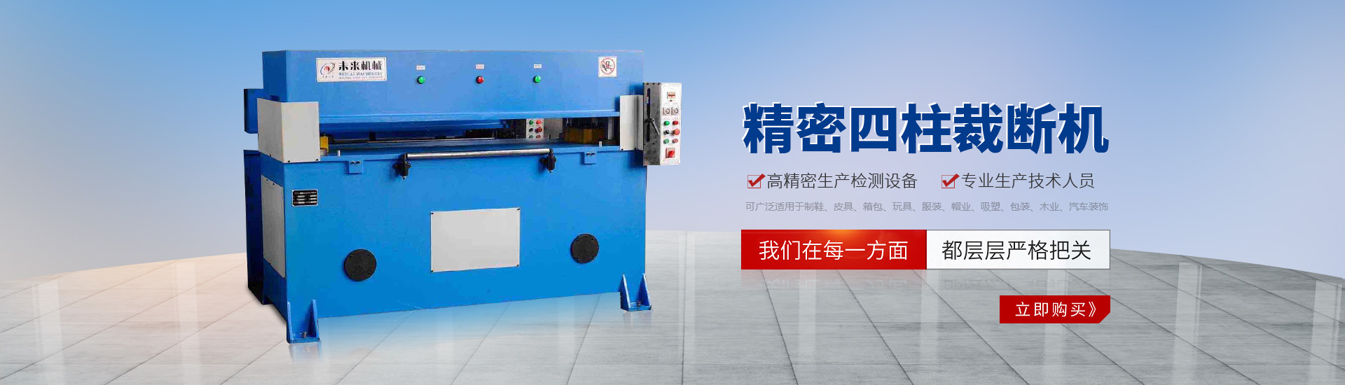 公司專業制造l 2T一25T液壓搖臂式裁斷機:25T一30T液壓平面式裁斷機;25T一30T液壓四柱龍門移動式裁斷機;25T一100T液壓四柱平面式裁斷機:30T一100T精密四柱式裁斷機(自動進料);100T一200T液壓四柱下壓式裁斷機(自動進料)和客戶要求的特型裁斷機械系列。產品規格齊全,可廣泛適用于制鞋、皮具、箱包、玩具、服裝、帽業、吸塑、包裝、木業、汽車裝飾等行業。
